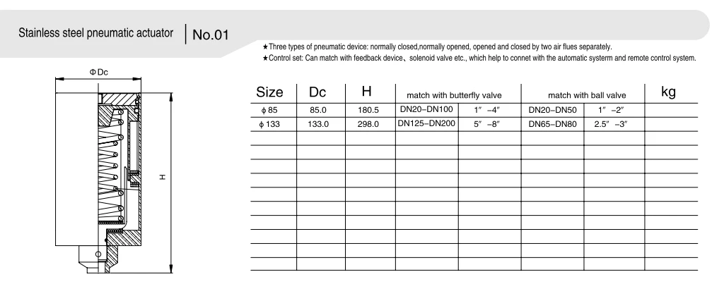 Den pneumatiske aktuator af den pneumatisk betjente sanitære sommerfugleventil driver ventilstammen til at rotere ventilskiven og dermed åbne og lukke ventilen. Når luft kommer ind i den ene side af aktuatoren, skubber den stemplet, hvilket får ventilspindelen til at rotere, hvilket afslutter åbningen og lukningen. Afhængigt af aktuatorstrukturen er den tilgængelig i to tilstande: dobbeltvirkende og enkeltvirkende.
